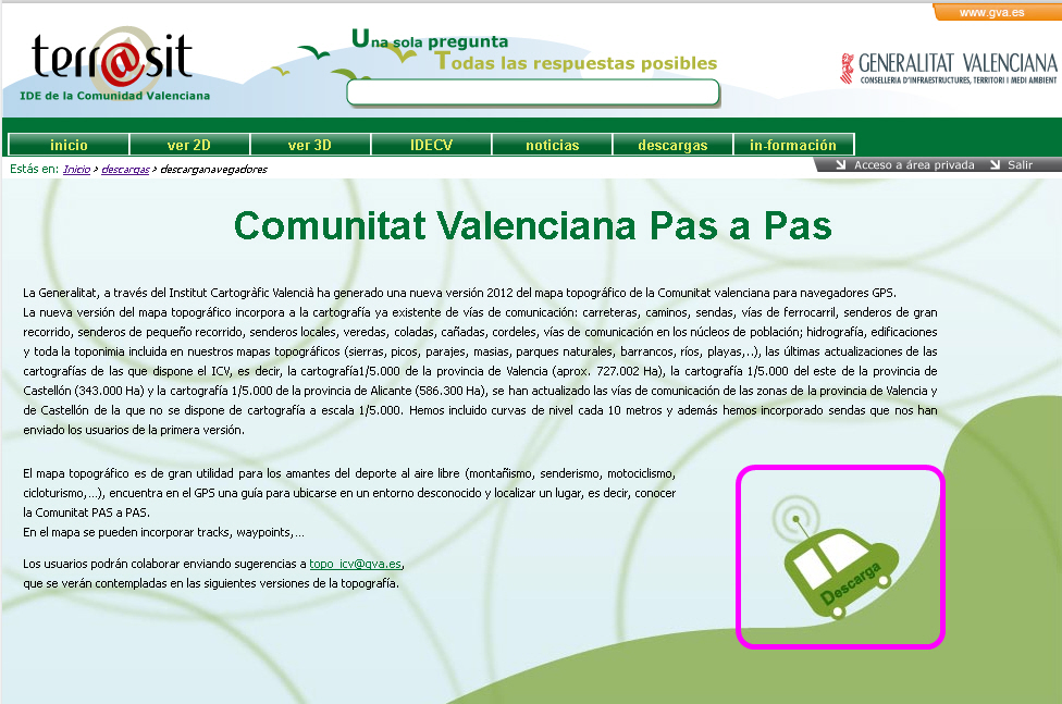 Nos leemos el texto de COMUNITAT VALENCIANA PAS A PAS. Luego sólo tenemos que darle al dibujo de un vehículo con una antena para entrar en la descarga: